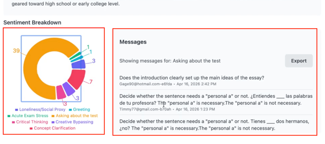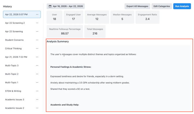 | Organizational | AI Message Sentiment | Aggregate sentiment across all users | Identify institution-wide trends and risks |